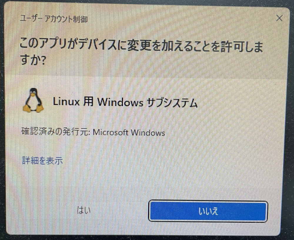 マイクロソフト:WSL のインストールに従いWSLをインストールする。